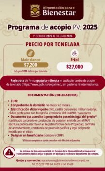 ![]() | Programa de Acopio P.V. 2025De octubre de 2025 al 30 de junio de 2026 maíz blanco a $7,200 y frijol a $27,000 por tonelada. |